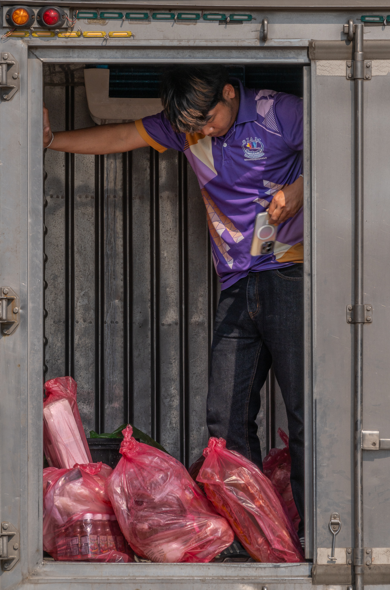 A delivery man pulls out his cellphone to document what he delivered, a ubiquitous action in Thailand.