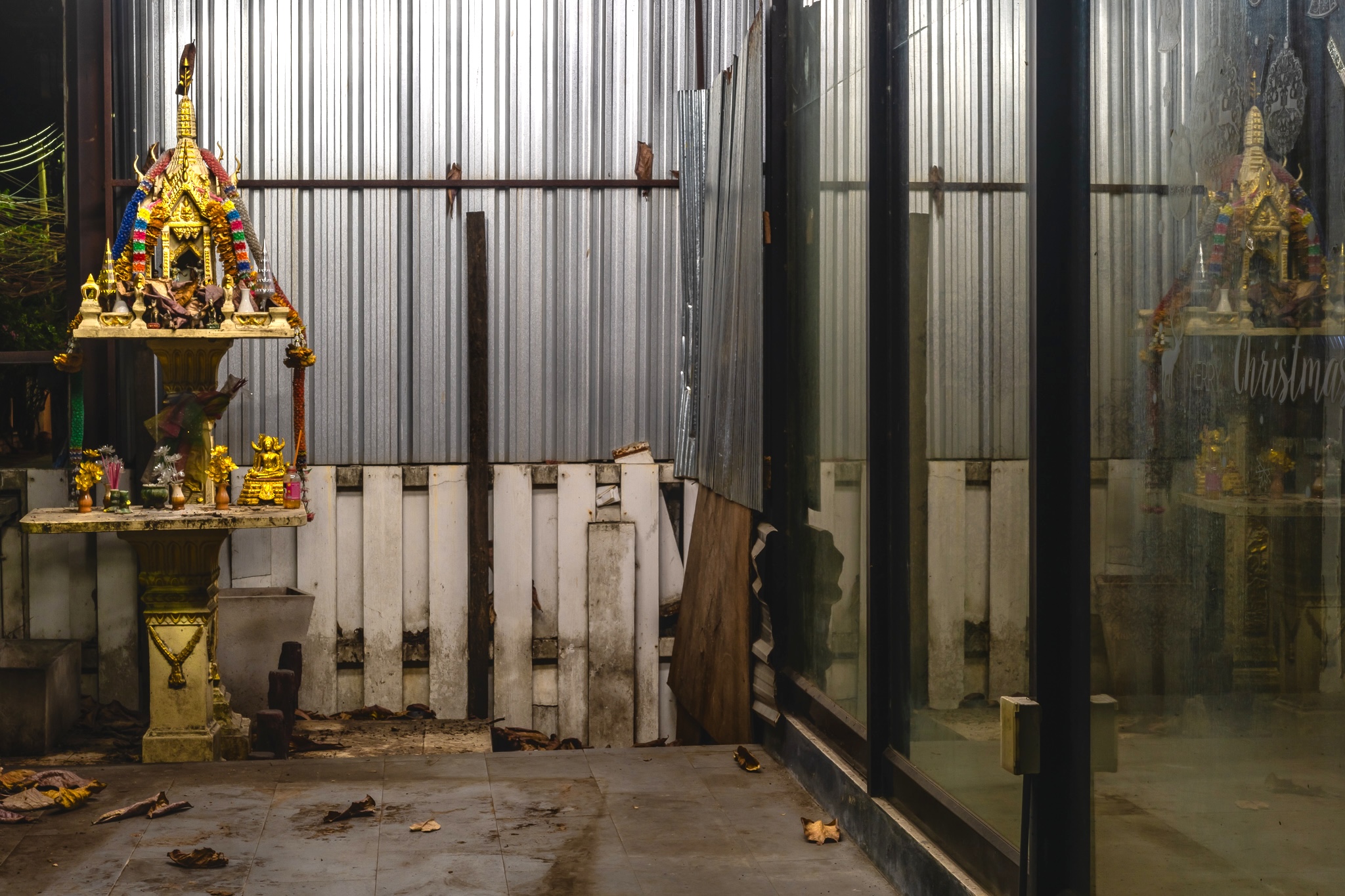 Really, this photo is a triple. There is a faint reflection of the spirit house in the corrugated metal sheet in the middle of the frame.