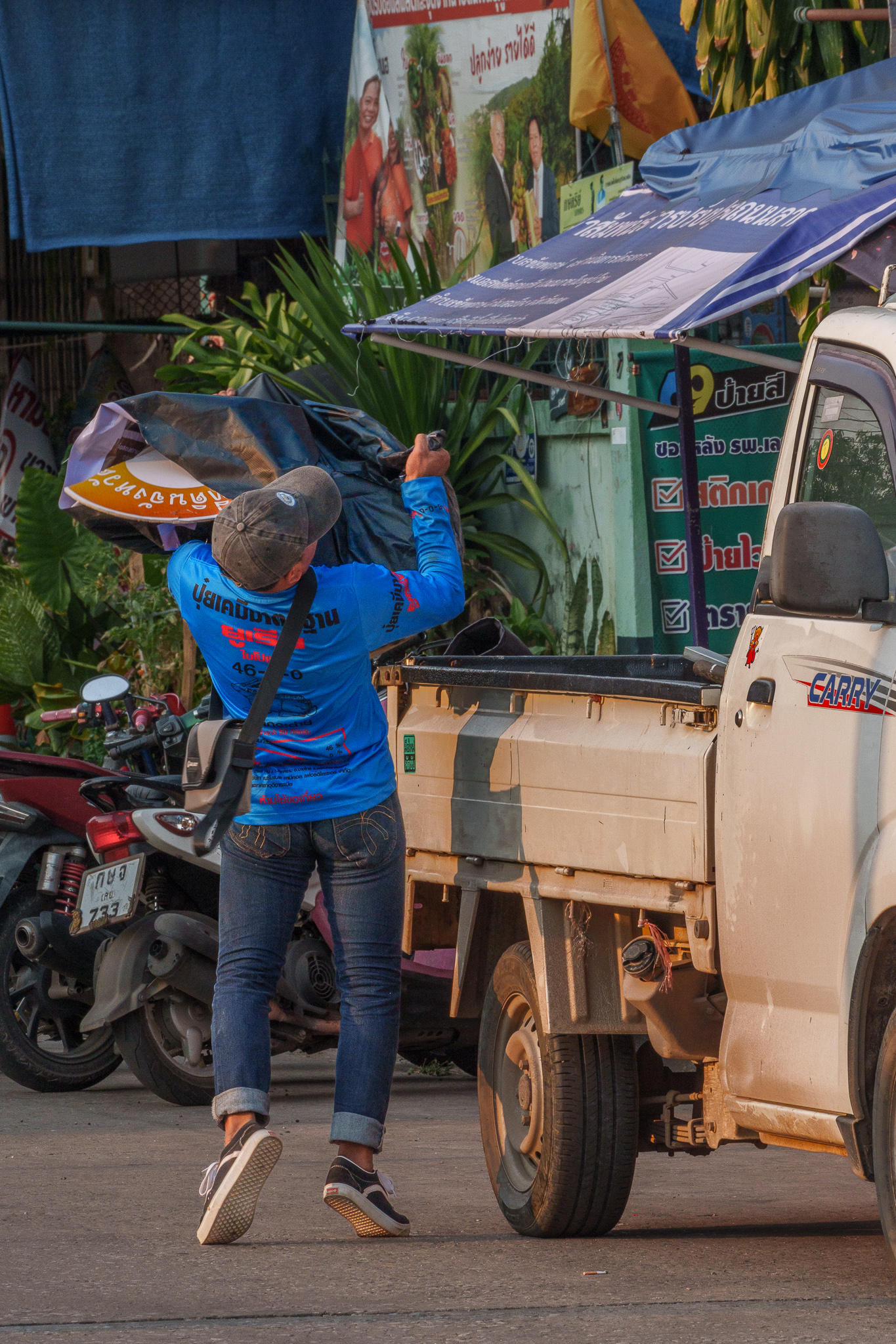 A man heaves a sack out of the back of a truck, balletic, as are so many Thais.