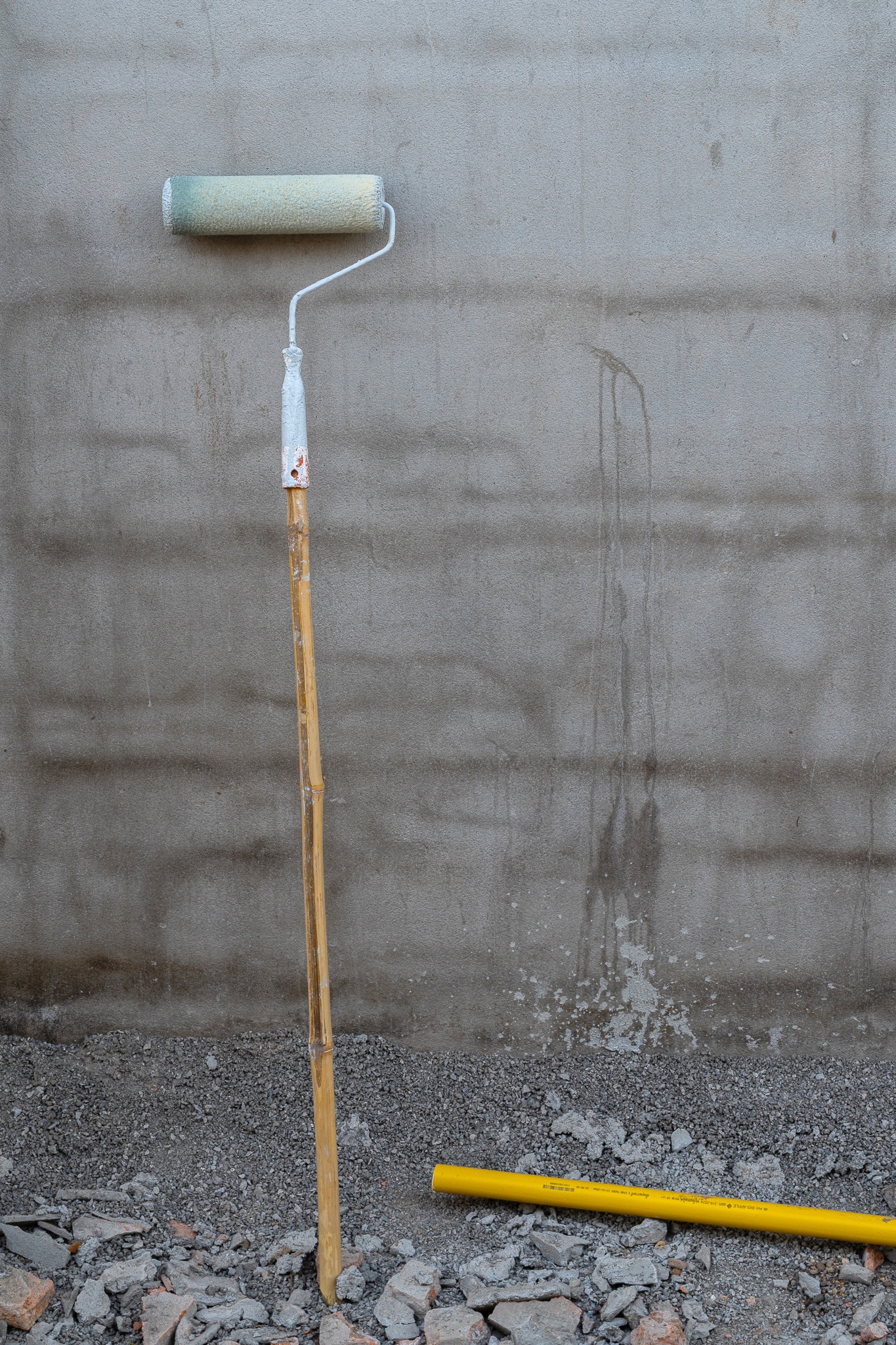 A pale green paint roller was propped up against a wall, drying. A length of yellow PVC pipe lies in the gravel at the foot of the wall.