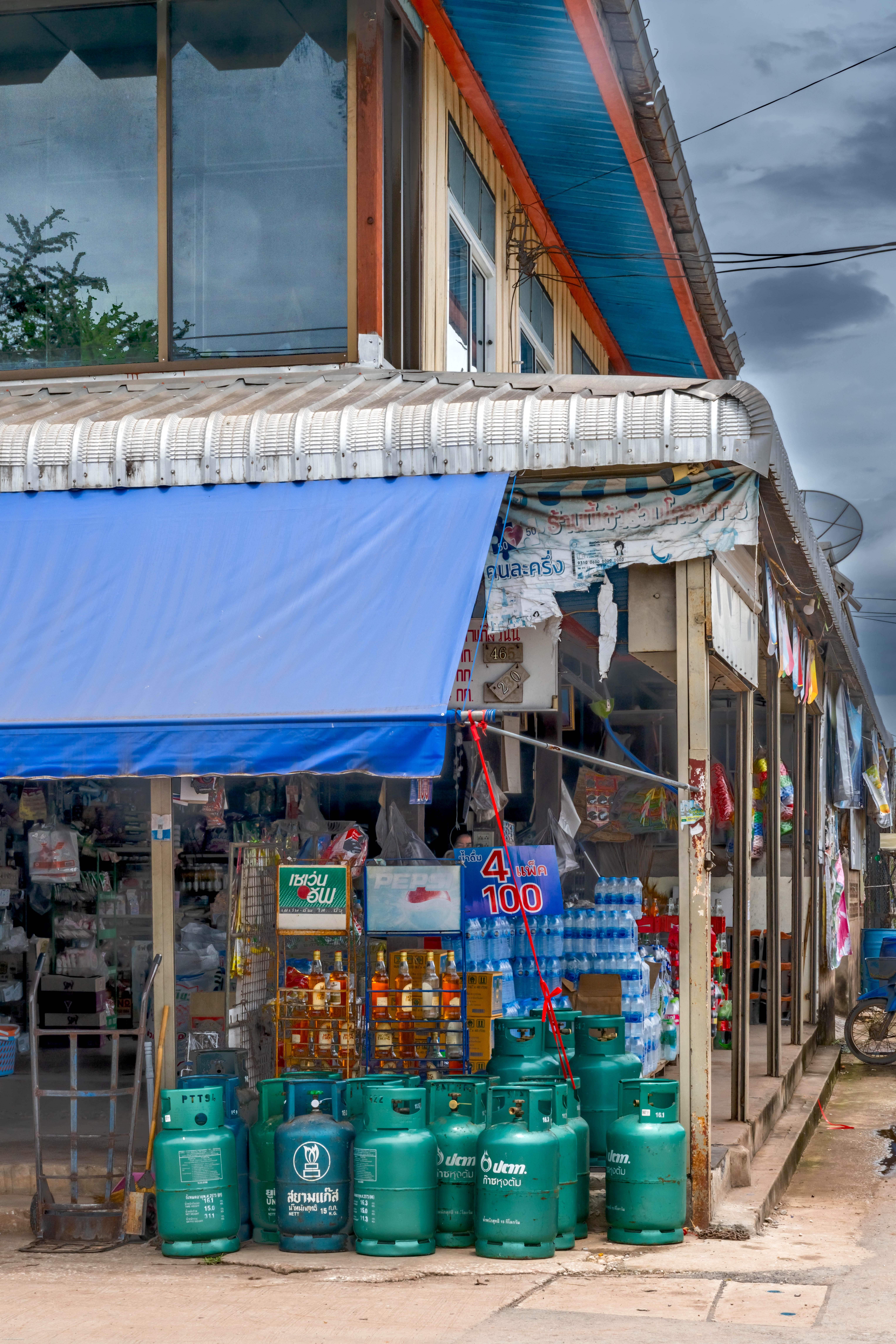 Green gas for cooking, gasoline in Hong Pong bottles for motosais, blue bottles of water.