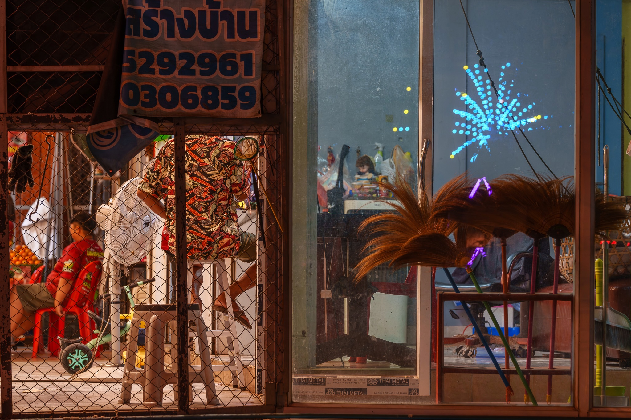 The right-hand window reflects blue lights from the fair; the brooms beneath echo the shape of the lights.