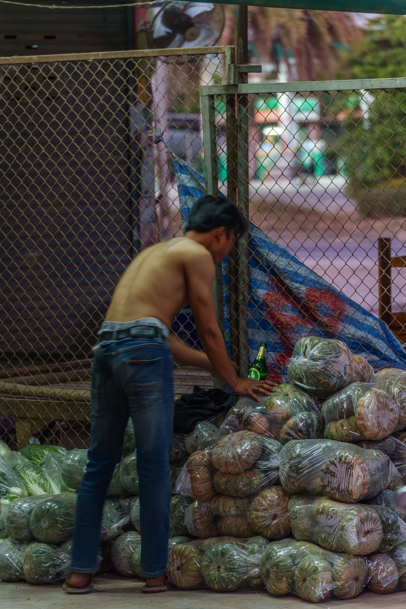 I don't like the green tone of the worker's skin, but there's a truck full of green vegetables behind him, out of the frame.