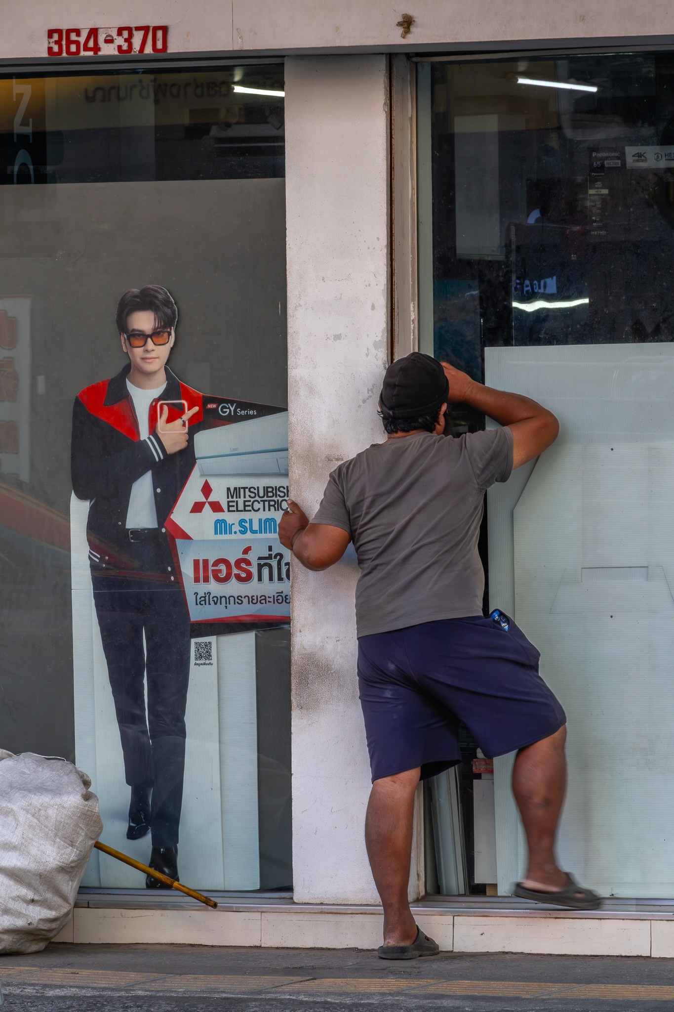 Normally, I don't photograph the homeless or bindlestiffs at all; I think it's too easy, besides being undignified for them. However, in this case, the tension between the very real watcher and the cardboard "Mr. Slim" was too great to pass up.