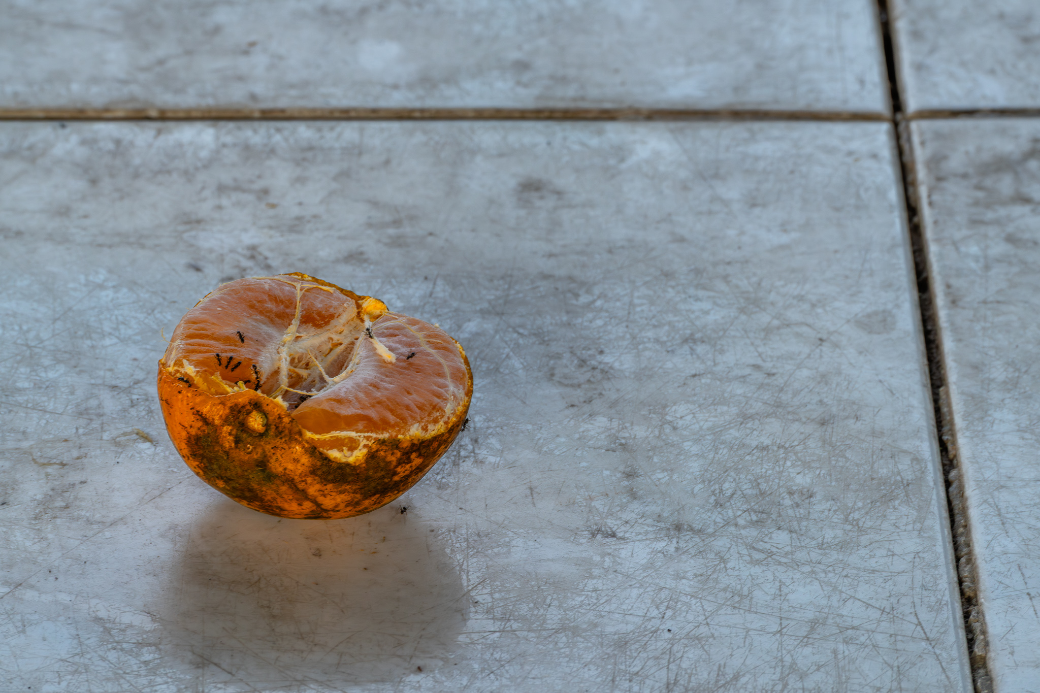 The ants are happy, but what I want to know is who leaves half an orange on a steel table at the market? Who took the peels away? And who ate the other half of the orange?