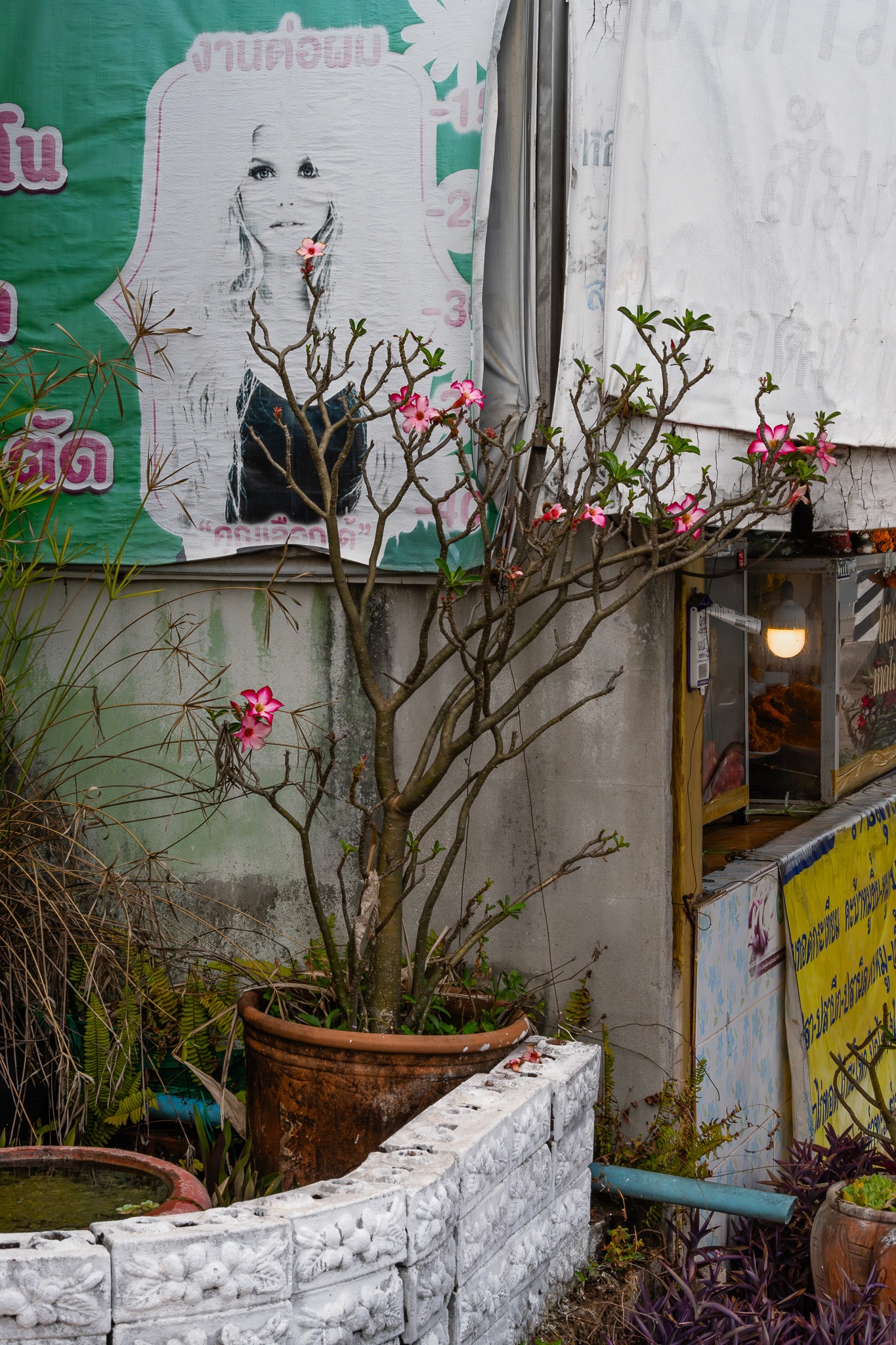 Climate has leached all the color from this poster of a woman. and transformed her into over-exposed black and white (the Thai over her head, at least  my phone, translates to "Work is slow"). Pink adenium, the blue pipe, the restaurant's yellow signage and orange fried chicken do what they can to make up for her, the white wall, and the other faded poster.